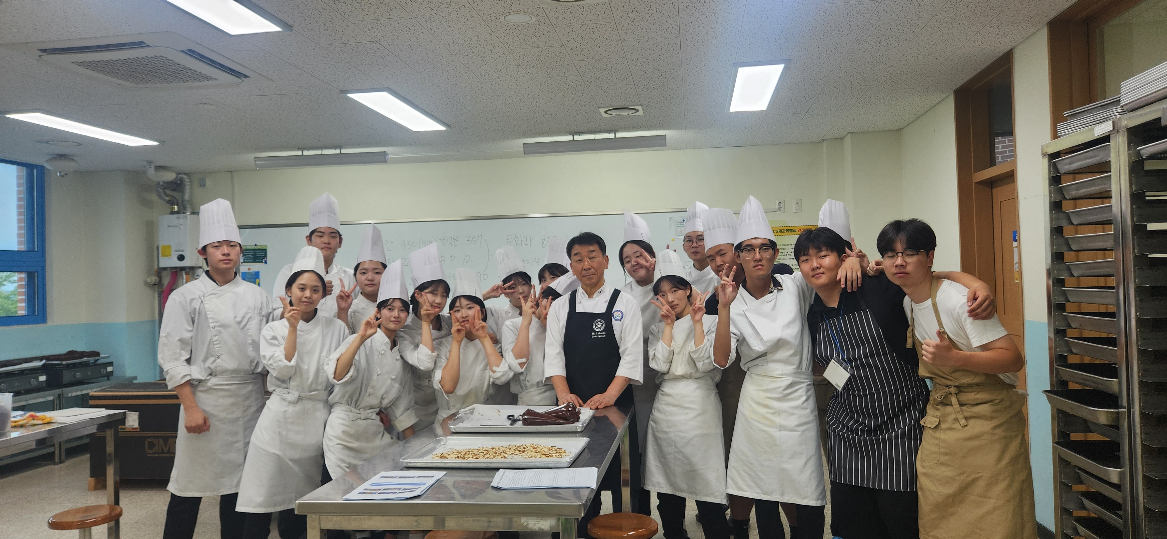 3학년 식품가공코스 제과 선택반 학생들과 해외인턴십 프로그램 학생들 간의 연계 수업 사진입니다